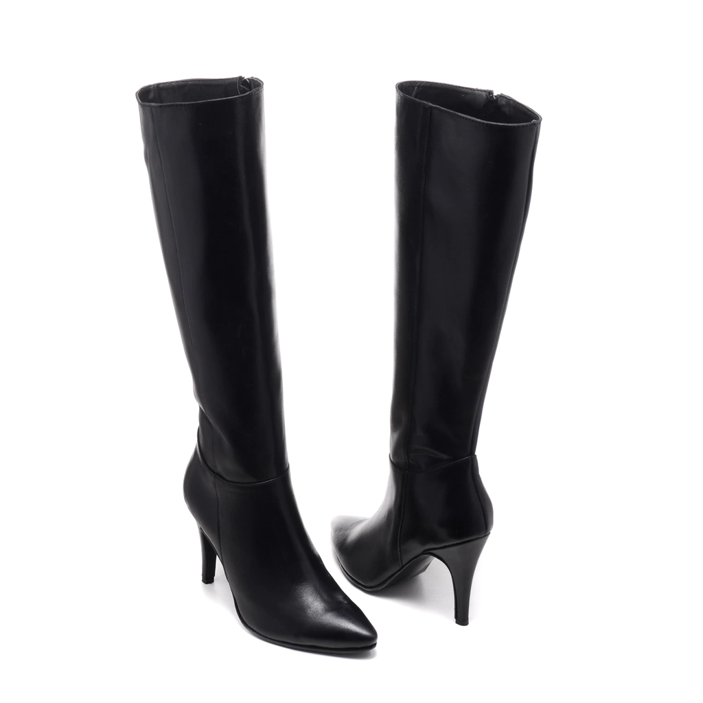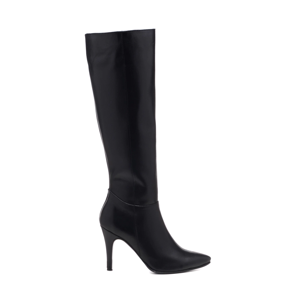 Material: Cuero | Color: Negro | Altura de taco: 9 cm | Altura de Caña: 40 cm | Ancho de caña: 34 cm