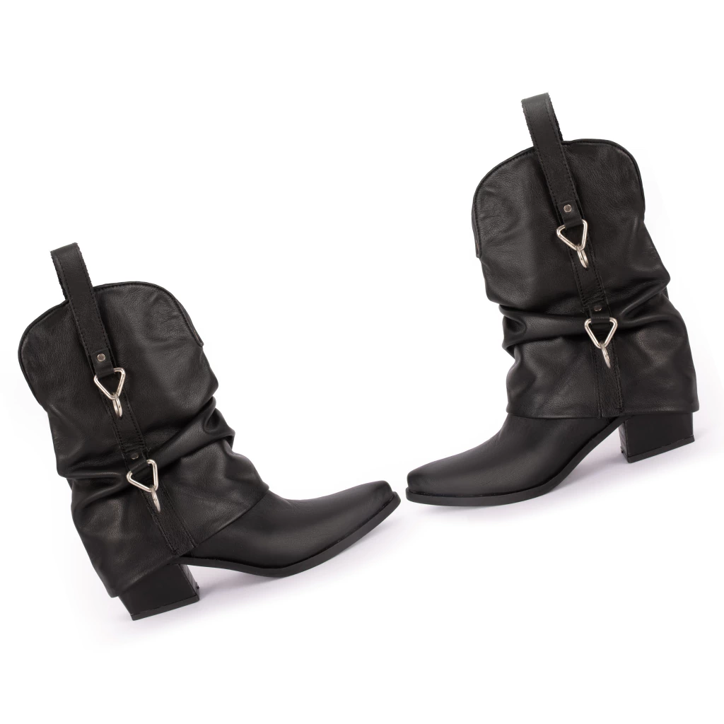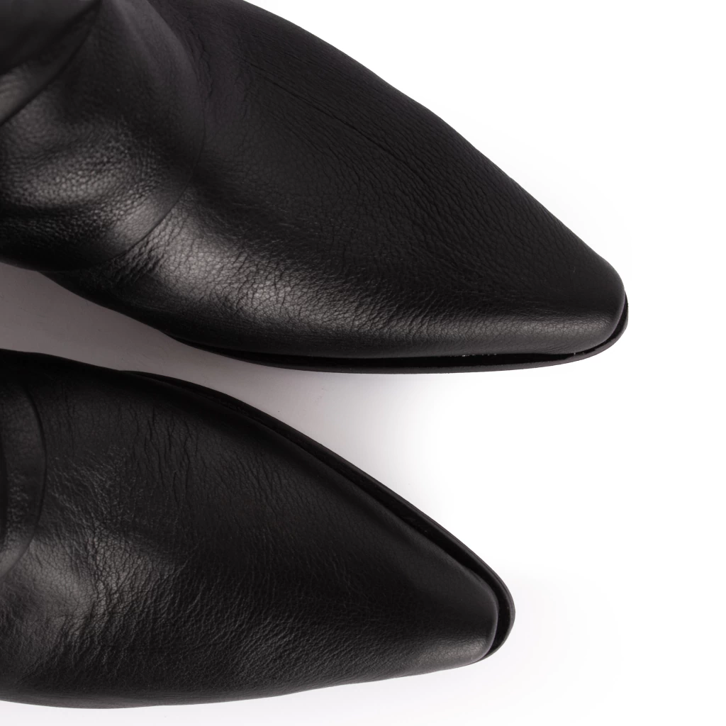 Material: Cuero | Color: Negro | Altura de taco: 5,5 cm | Altura de caña: 24,5 cm | Ancho de caña: 32 cm.(ó más según talle)