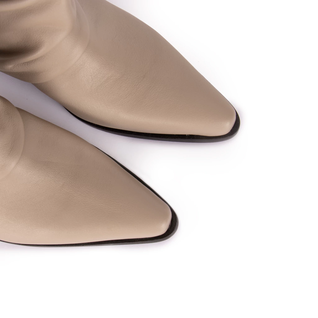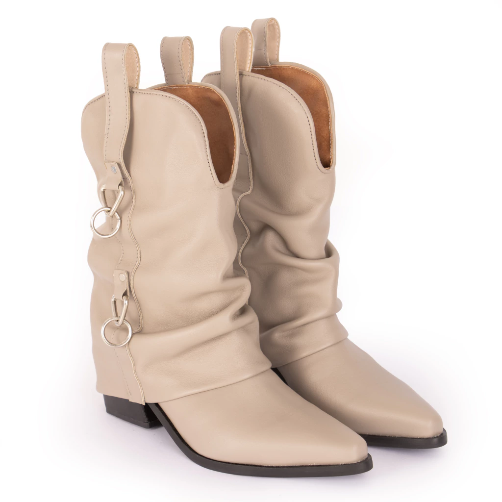 Material: Cuero | Color: Antílope | Altura de taco: 5,5 cm | Altura de caña: 24,5 cm | Ancho de caña: 32 cm.(ó más según talle)