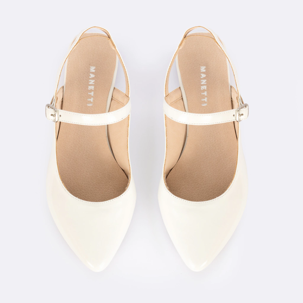 Simona en charol off white aporta luz y frescura a un diseño delicado y femenino. Su punta fina estiliza, mientras la pulsera con hebilla brinda sujeción y un detalle sofisticado. El acabado charolado en tono claro la convierte en una pieza versátil, perfecta para elevar looks diurnos o sumar un toque chic a la noche.