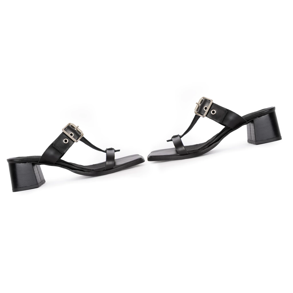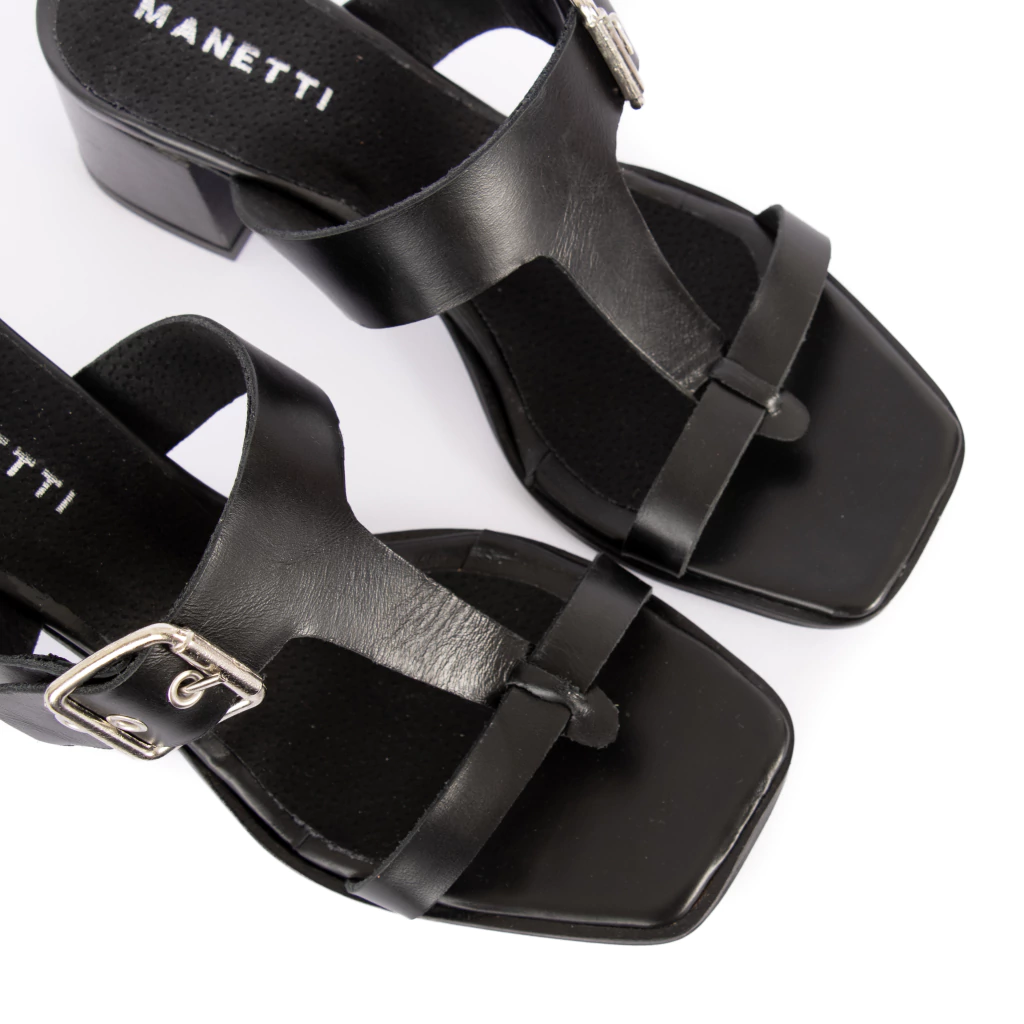 Equilibrio perfecto entre diseño y confort. Calypso se distingue por su silueta contemporánea y su impronta minimalista, donde cada detalle suma estilo y funcionalidad. El cuero negro liso, la hebilla metálica y el taco ancho crean una propuesta versátil y sofisticada que acompaña tanto un look urbano como uno más refinado.Su base firme y la plantilla soft garantizan una pisada cómoda, ideal para llevar durante todo el día sin resignar elegancia. Una sandalia que refleja el espíritu MANETTI: fuerte, femenina y con carácter propio.